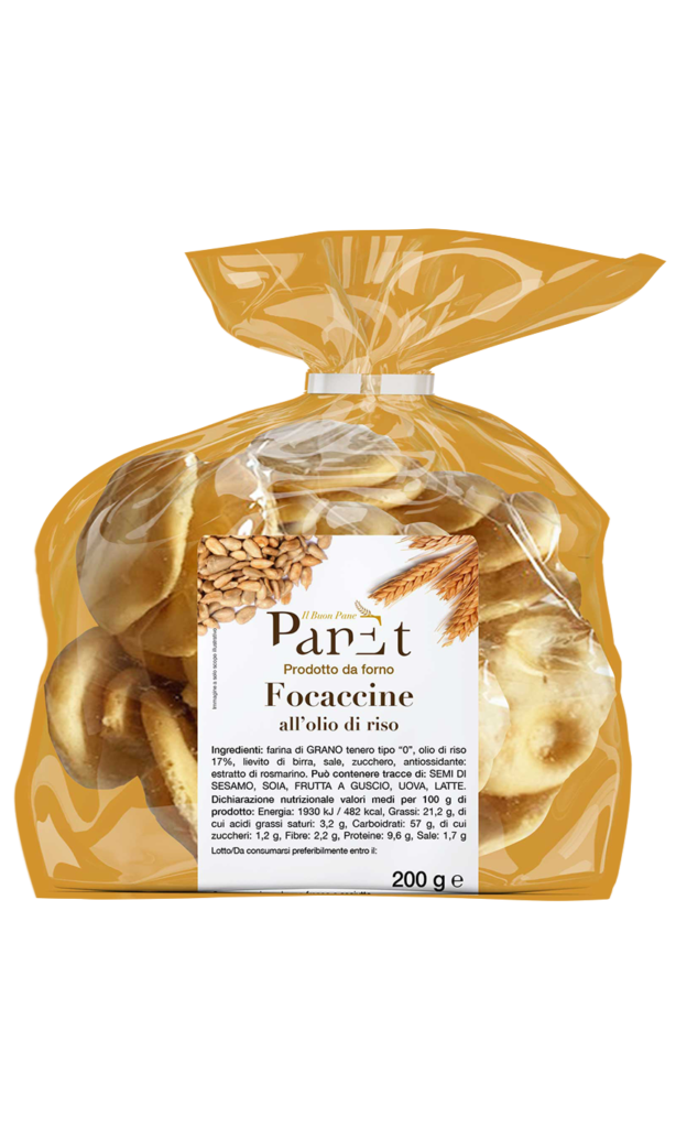 Farina di GRANO tenero tipo “0”, olio di riso 17%, lievito di birra, sale, zucchero, farina di CEREALI (FRUMENTO) maltati, antiossidante: estratto di rosmarino. Può contenere tracce di: SEMI DI SESAMO, SOIA, FRUTTA A GUSCIO, UOVA, LATTE.