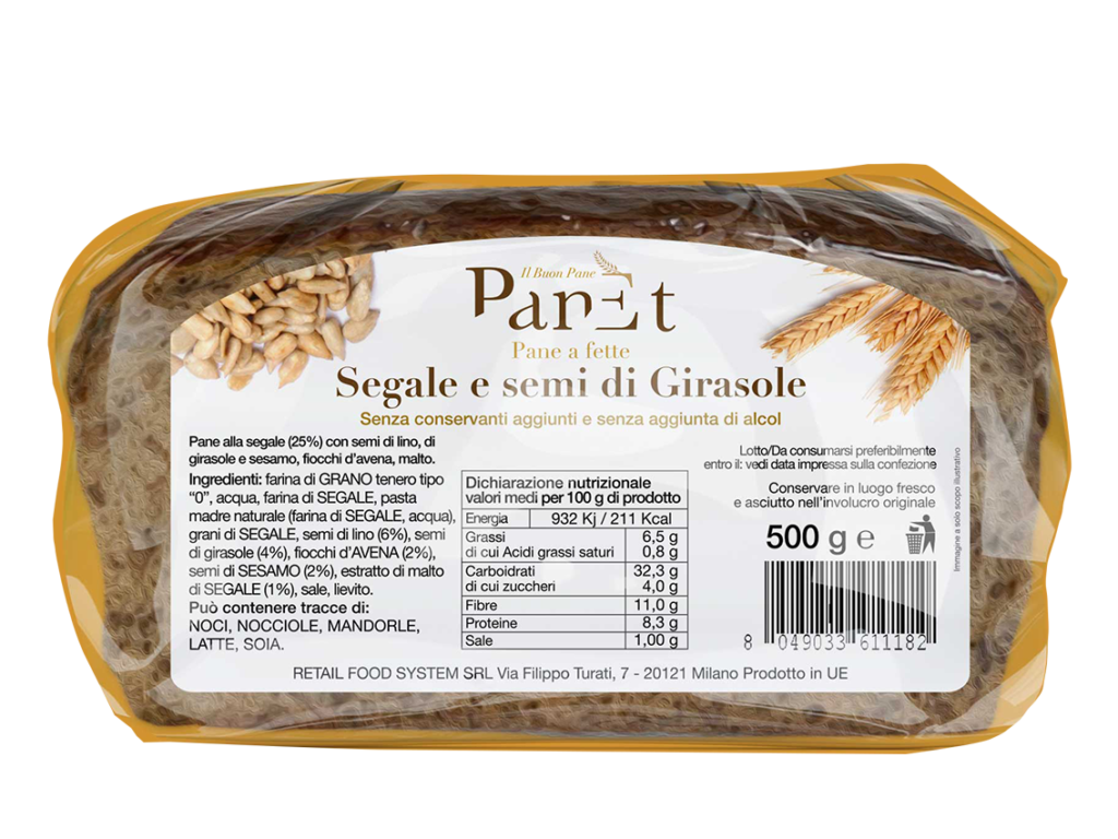 Pane alla segale (25%) con semi di lino, di girasole e sesamo, fiocchi d’avena, malto.